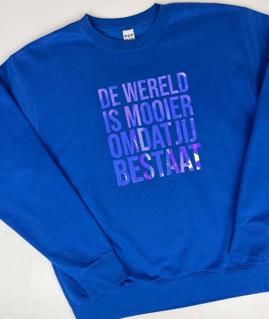 De wereld is mooier omdat jij bestaat… zeg ‘t met een sweater! In kobaltblauw met mermaid… Vergeet niet om extra vaak je eigen trui te lezen wanneer je ‘m draagt.