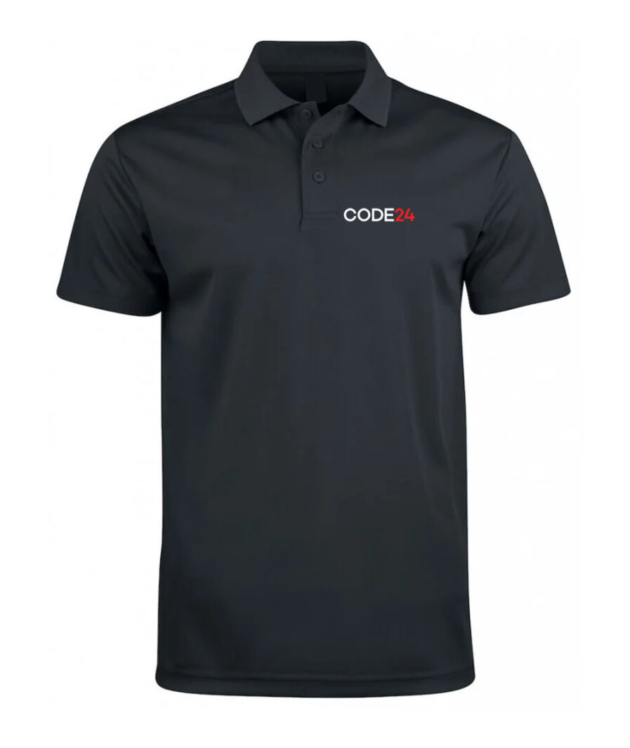 Zwarte of witte CODE24 polo met logo mooi subtiel op de borst en twee rode streepjes op de mouw.