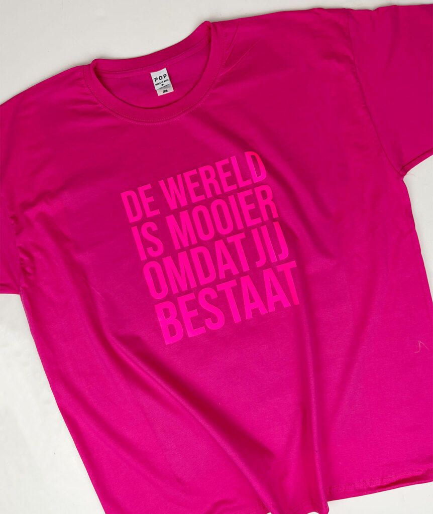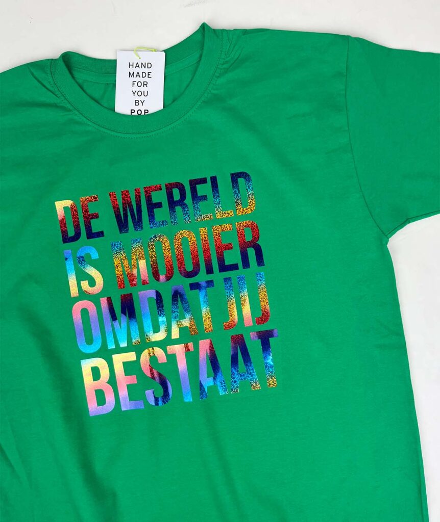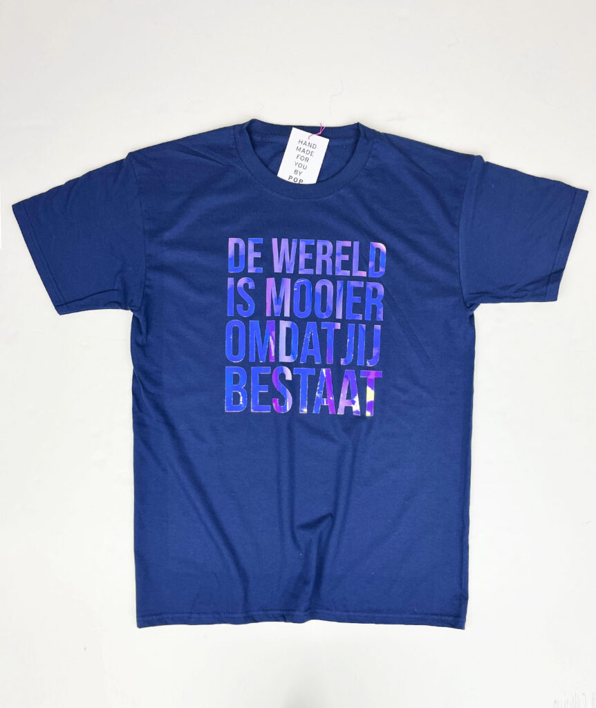 De wereld is mooier omdat jij bestaat… zeg ‘t met een t-shirt! Gemaakt van een lekkere dikke stof en in een mooi recht model. Verkrijgbaar in 3 kleuren… navy met mermaid, groen met regenboog en fuchsia met neonroze. Vergeet niet om extra vaak je eigen shirt te lezen wanneer je ‘m draagt.