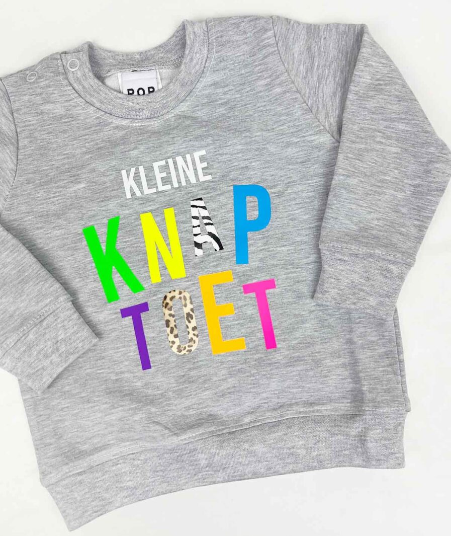 Lichtgrijze baby sweater voor alle kleine knaptoetjes… Let op! Verschilt van de afbeelding hiernaast, jij ontvangt het product exclusief kwijl.