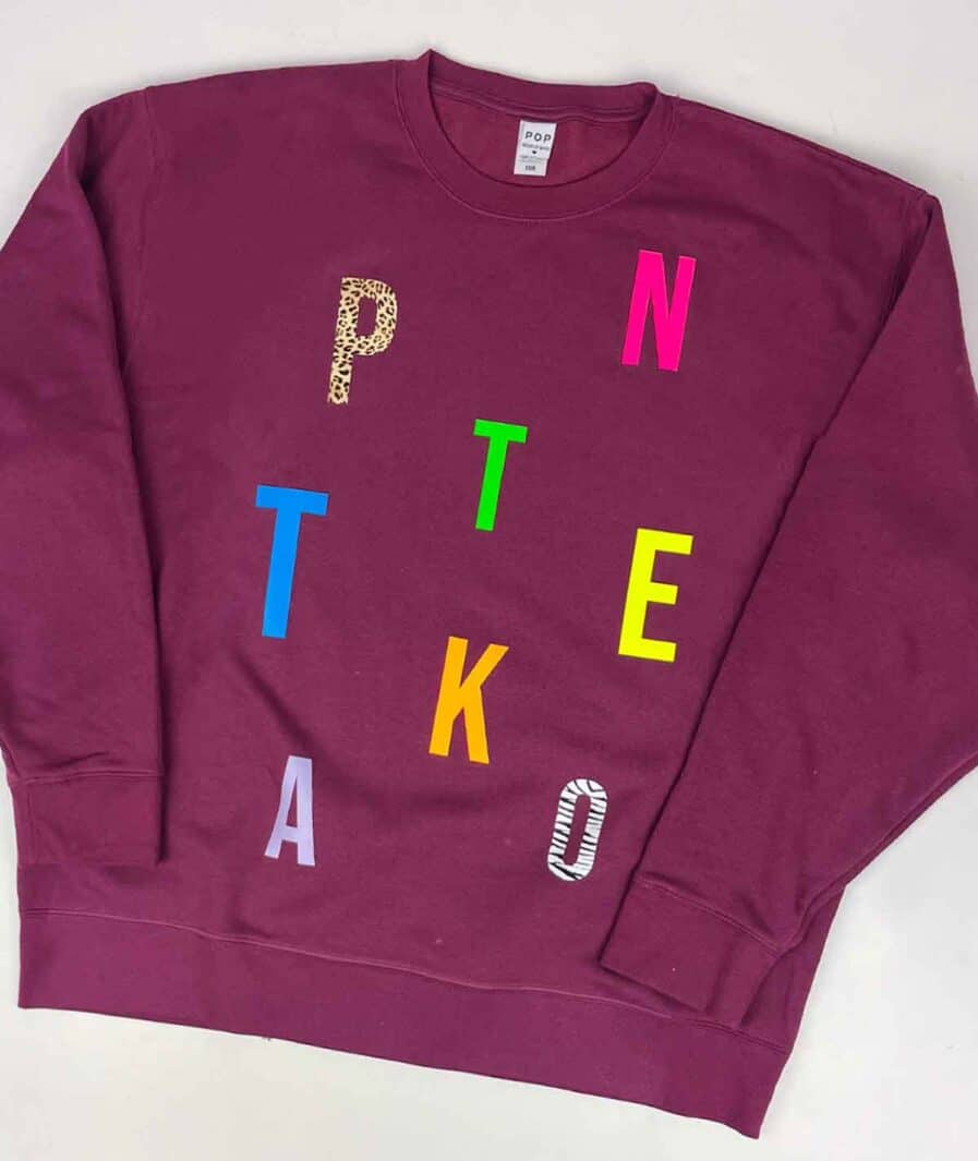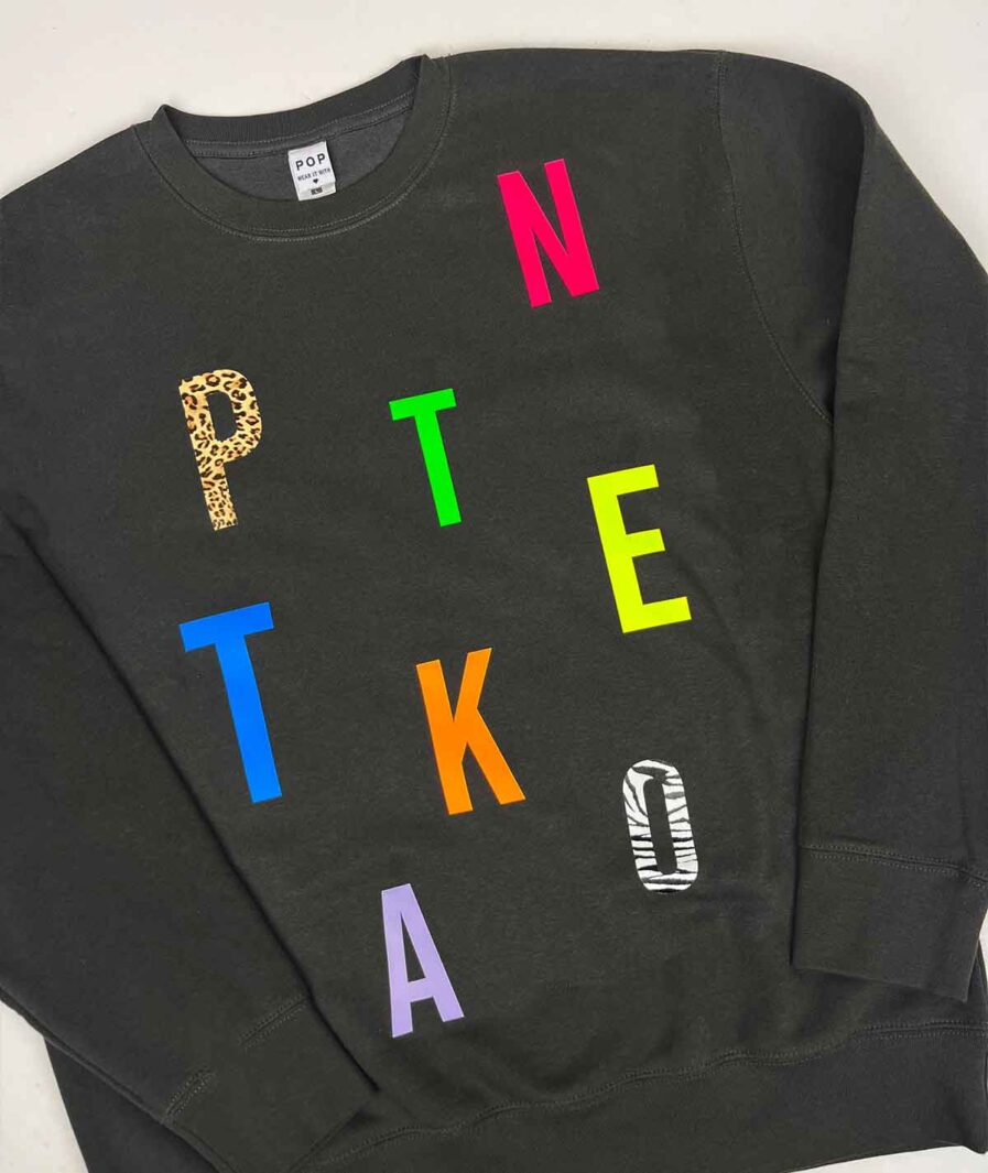Super comfy sweater in donkergrijs of bordeauxrood met de letters K N A P T O E T in alle kleuren van de regenboog, gehusseld als confetti. Dus jij weet dat er knaptoet staat, maar anderen niet… Twijfel je of je wel een knaptoet sweater waardig bent? Niet doen. Ben jij. De wereld is mooier omdat jij bestaat.