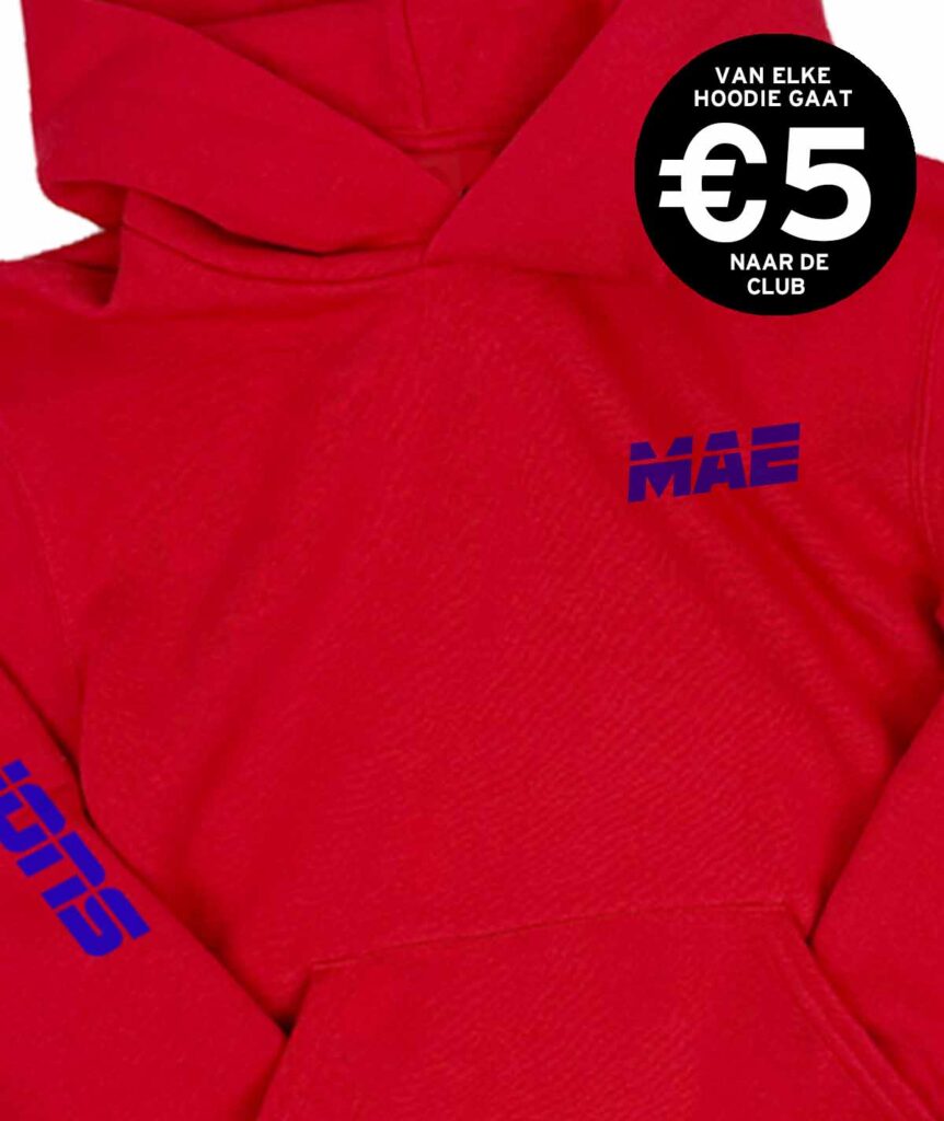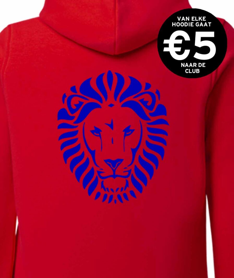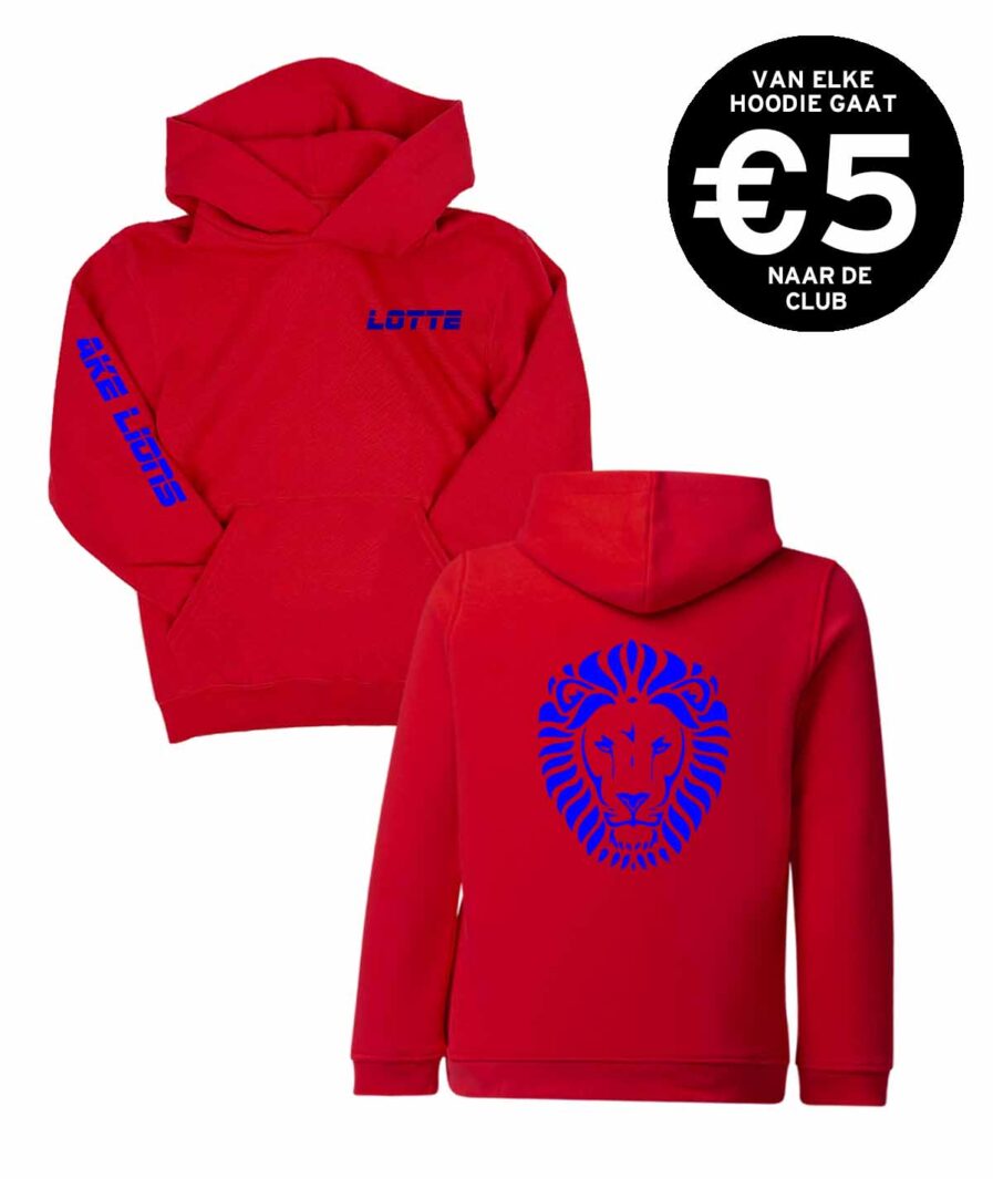 Rode hoodie met naam op de borst, Landslake Lions op de mouw en leeuw op de rug in het blauw. Twijfel je over de maat? Check de afmetingen op de maattabel!