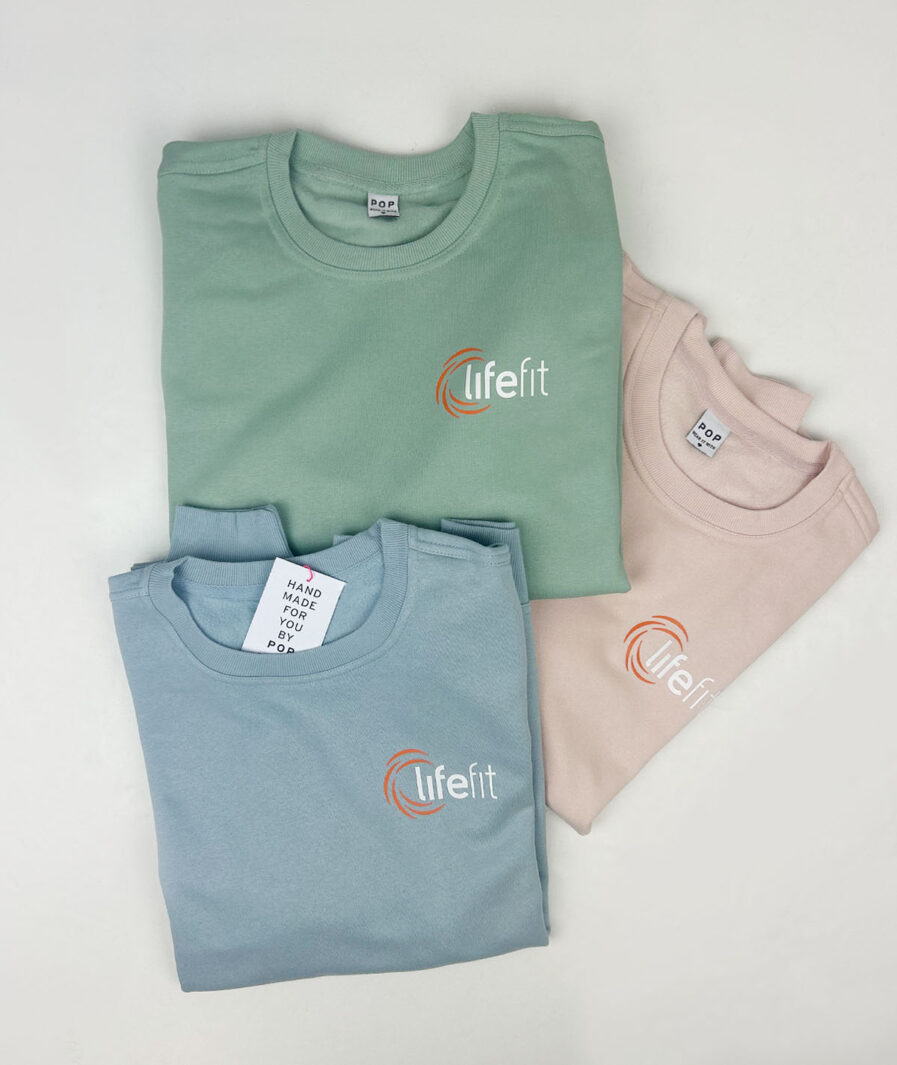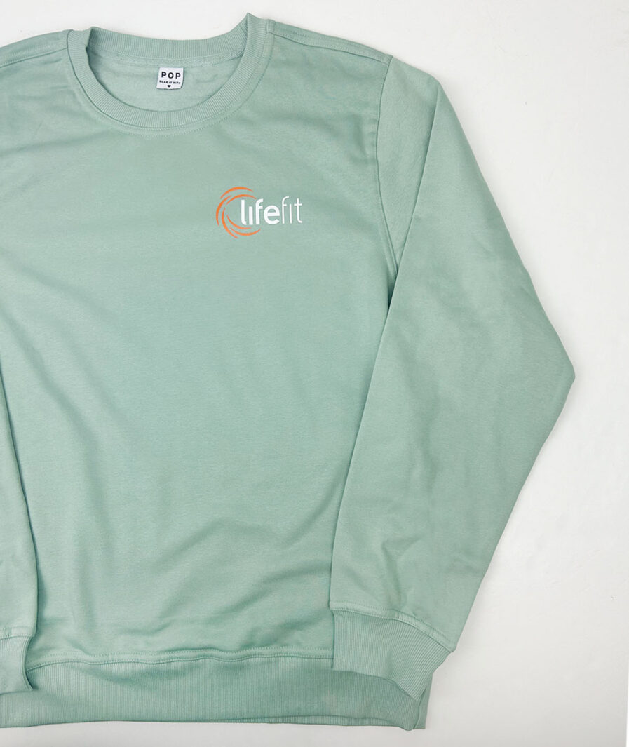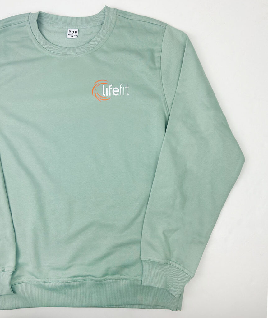 Mooie, zachte Lifefit sweater in zacht groen met motivational quote op de rug en klein logo op de borst.
